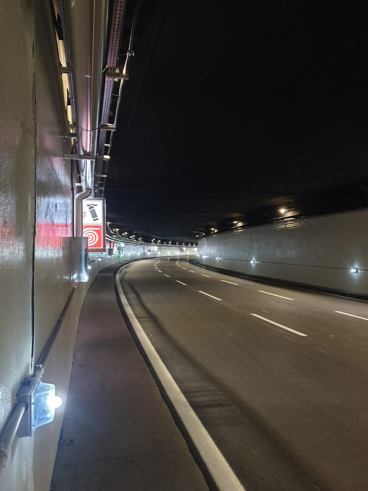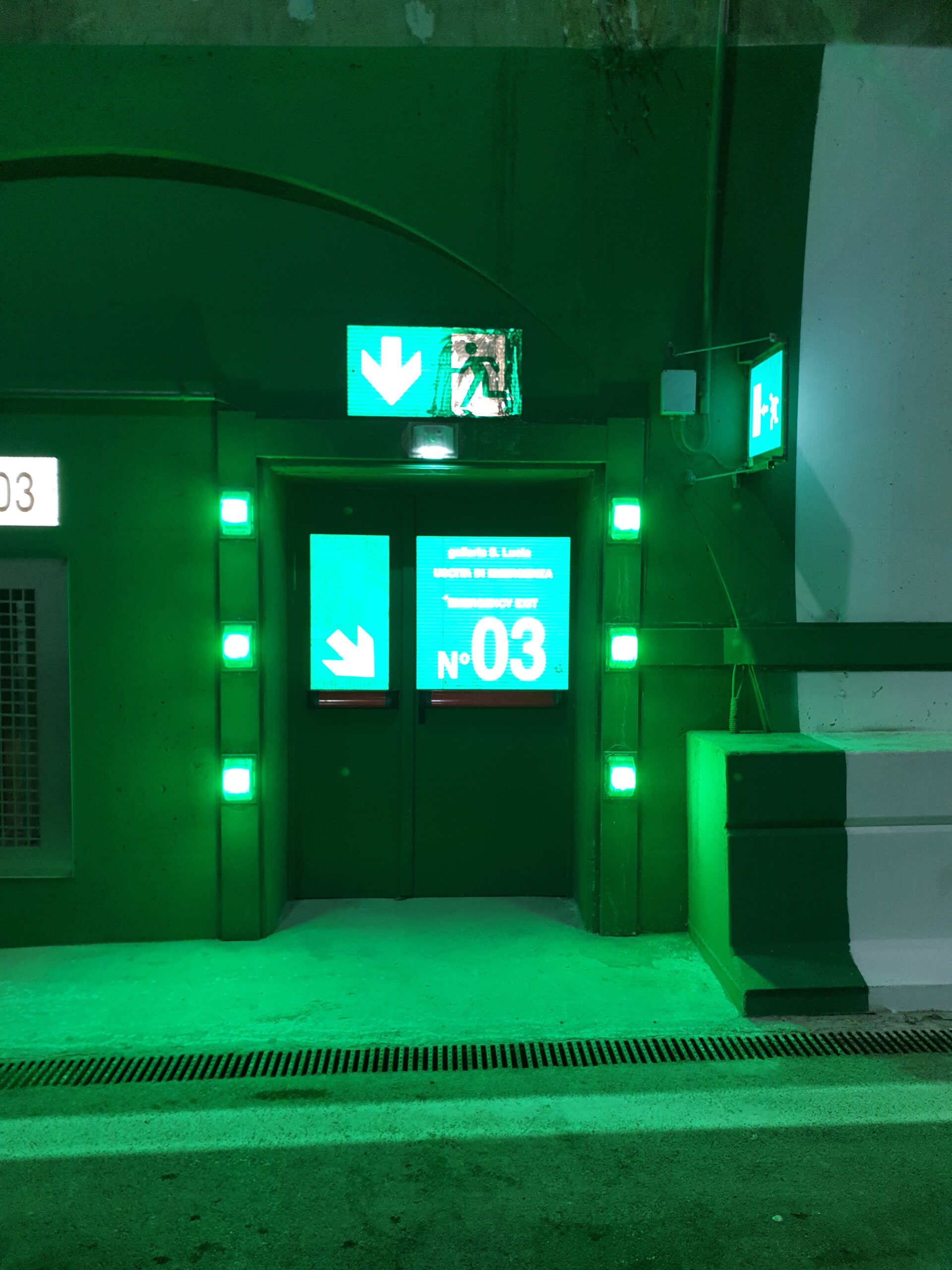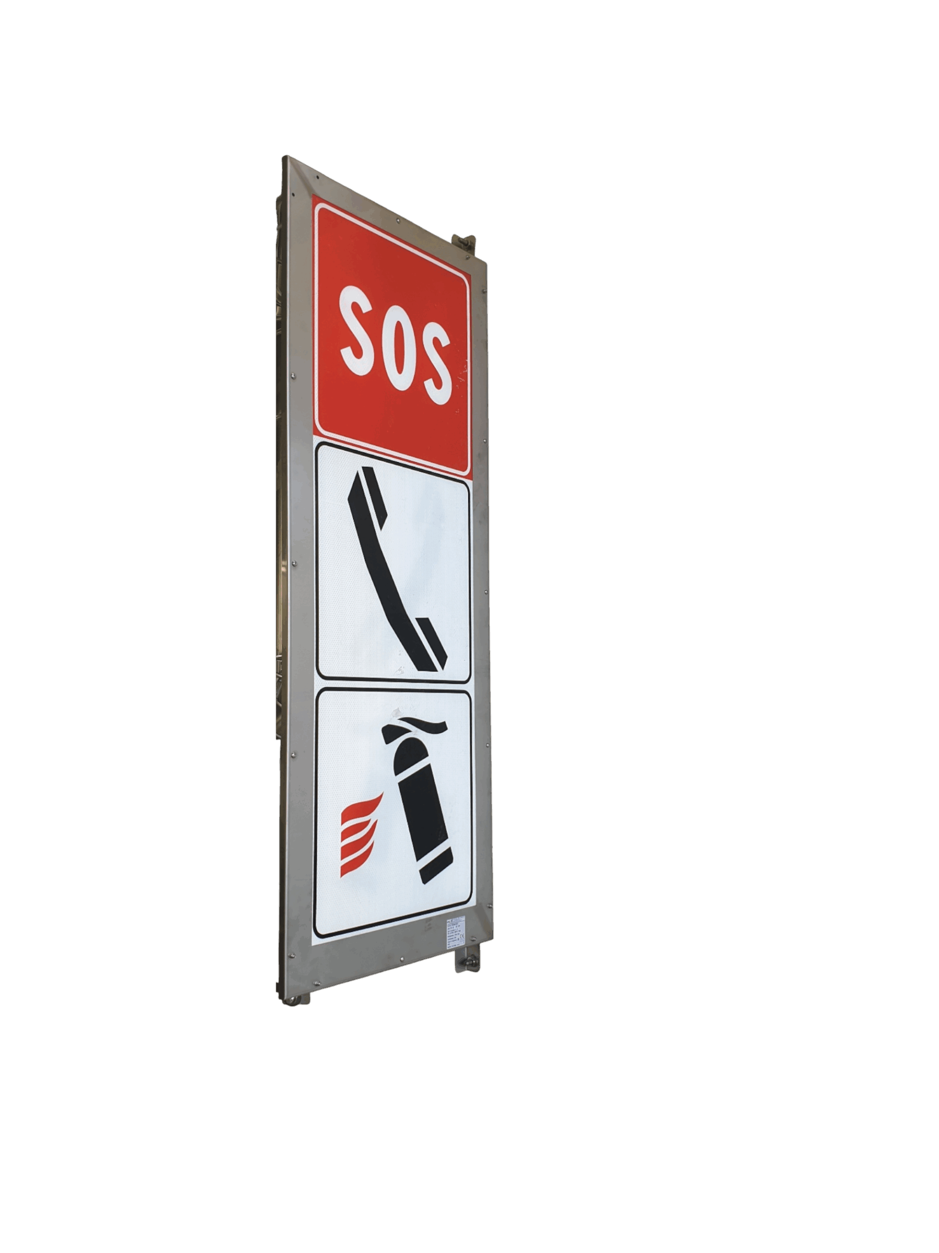 Segnale luminoso per segnaletica di sicurezza in galleria costituito da un cassonetto luminoso bifacciale (IP65) ultrasottile per installazione a bandiera con area utile di rappresentazione 40×120 cm (fare riferimento al disegno allegato per le dimensione complessive della struttura completa di staffe).